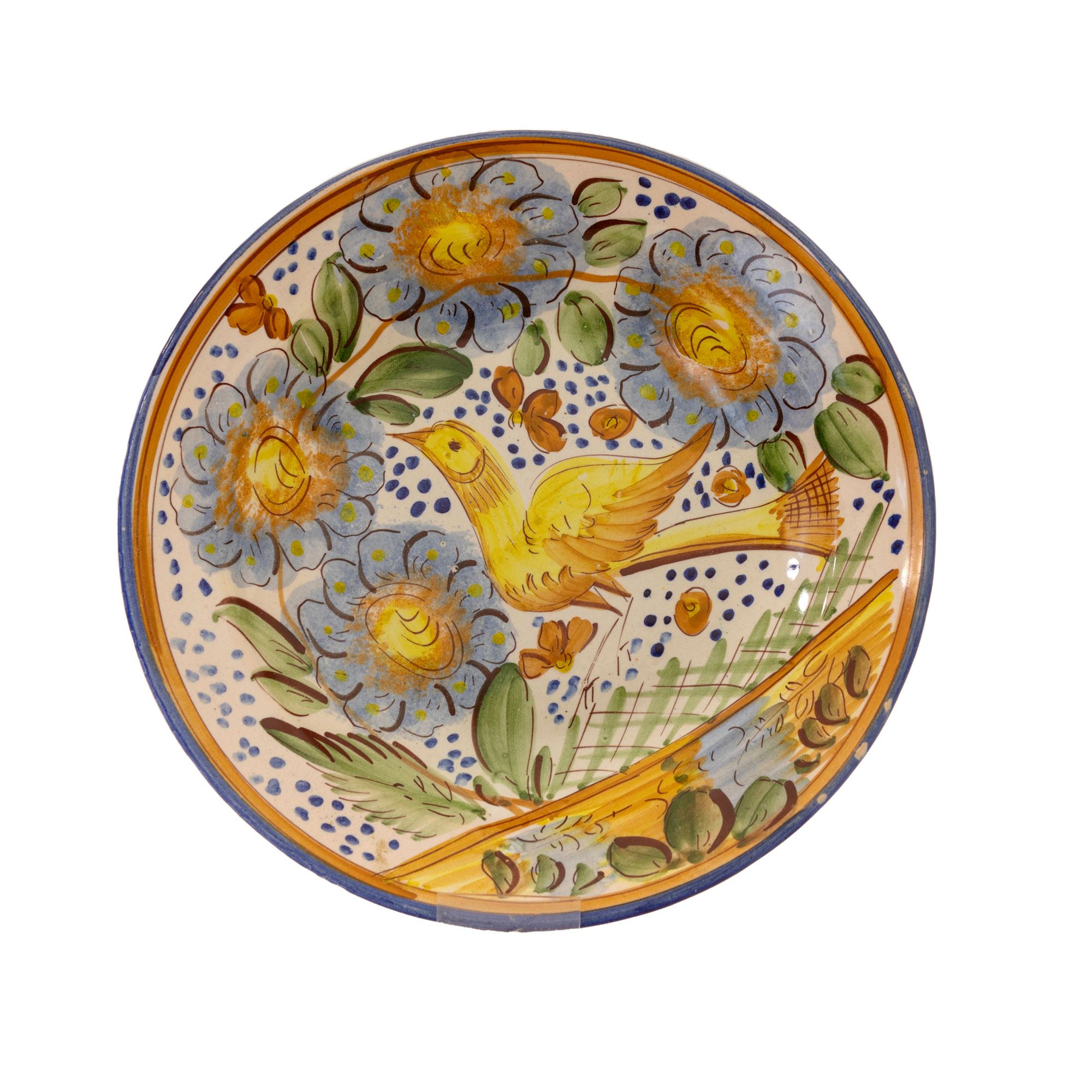 Plato decorativo en cerámica esmaltada de Manises, con representación central de paloma inscrita en una guirnalda floral.