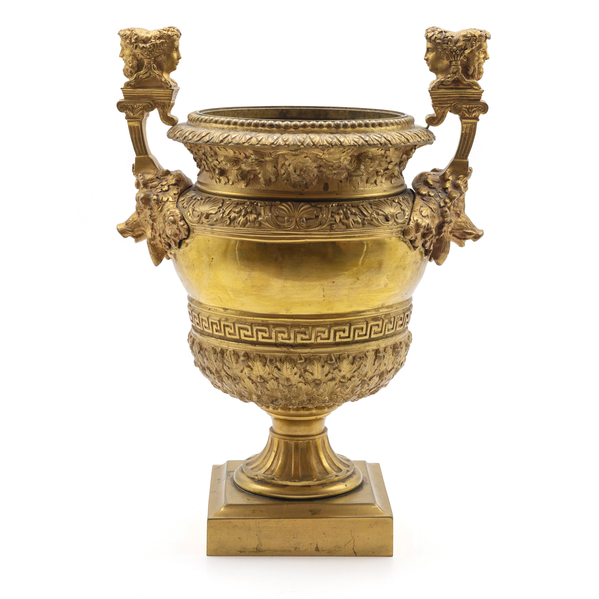 Copa de bronce dorado siguiendo en el modelo realizado por Claude Ballin (1615 - 1678) para el Palacio de Versalles.Asas con cabezas de Jano y cabezas de jabali.El collar esta decorado por hojas de roble y conchas.La base de seccion cuadrada se decora co hojas de roble y bellotas.Gran Tour