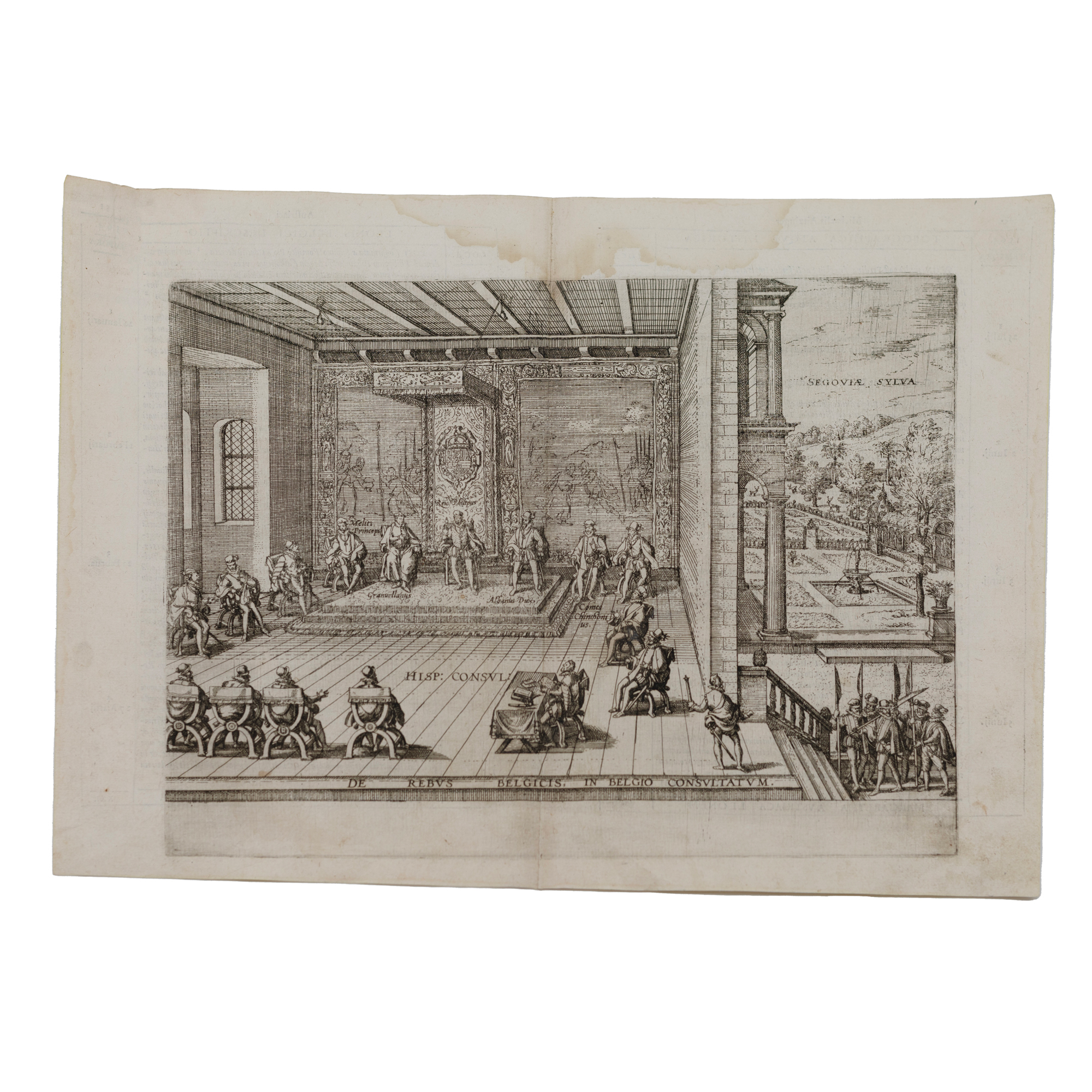 Segoviae Sylva. Rex Philipus.... Grabado en blanco y negro con mancha de humedad en parte superior que apenas afecta