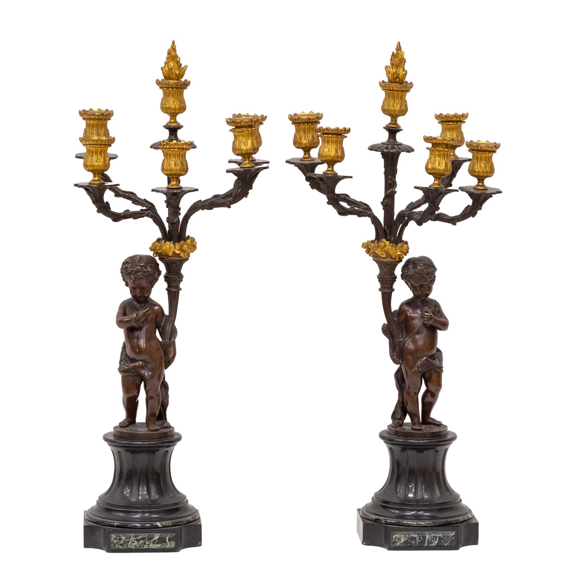 Pareja de candelabros de seis luces con figuras de niños. Realizados en bronce con patina medalla y oro al mercurio